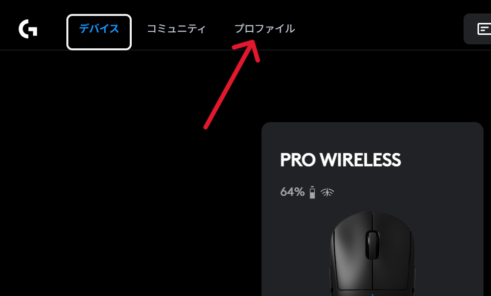 まずはG HUBのデバイスタブを開き、今使っているマウスを選択。
