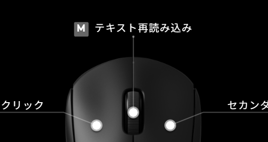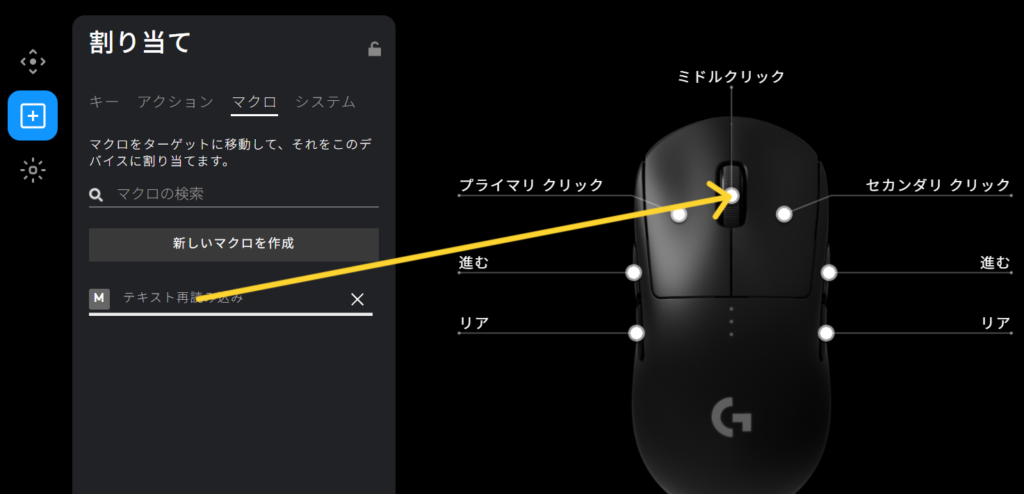 先ほど作った「テキスト再読み込み」のマクロが表示されるので、それをミドルクリックの場所にドラッグ&ドロップすればマクロが割り当てられます。