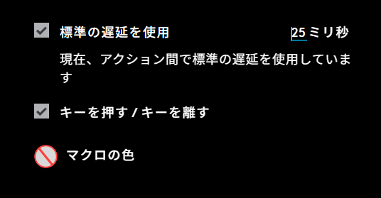 マクロのタイプを選択すると、マクロの作成画面に移動します。まずは右上にある「標準の遅延を使用」の秒数を25ミリ秒に変更。