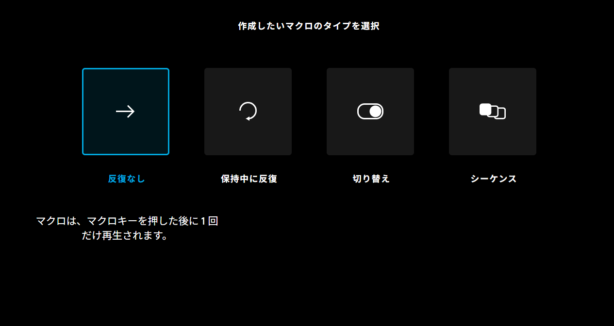 次にマクロのタイプの選択。今回は任意のボタンを押したら一度だけ実行されれば良いため、反復なしを選択。